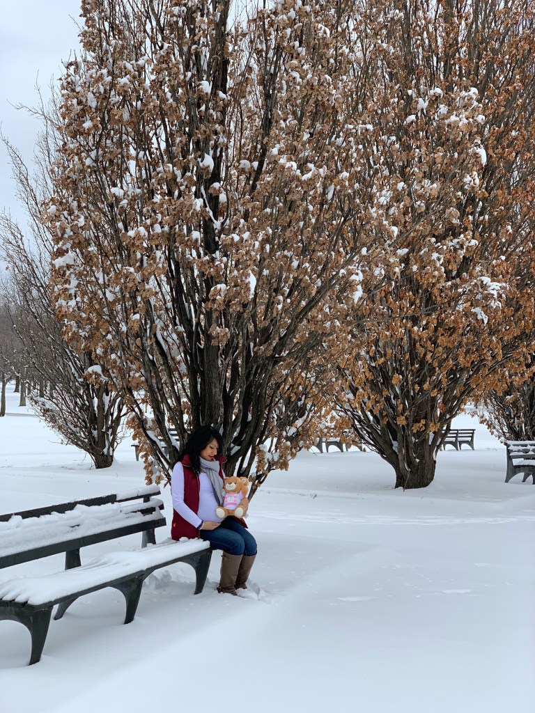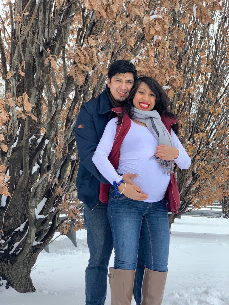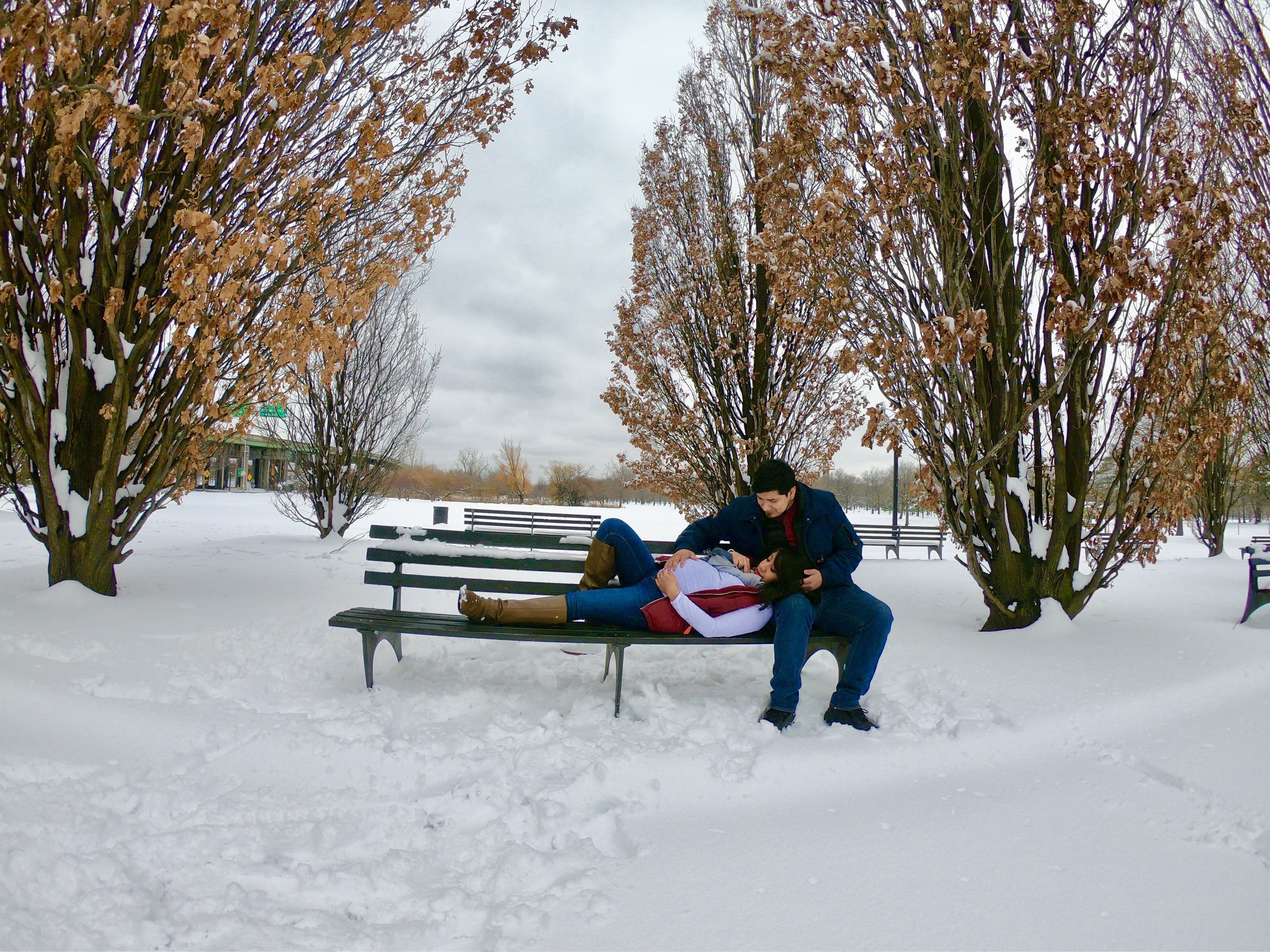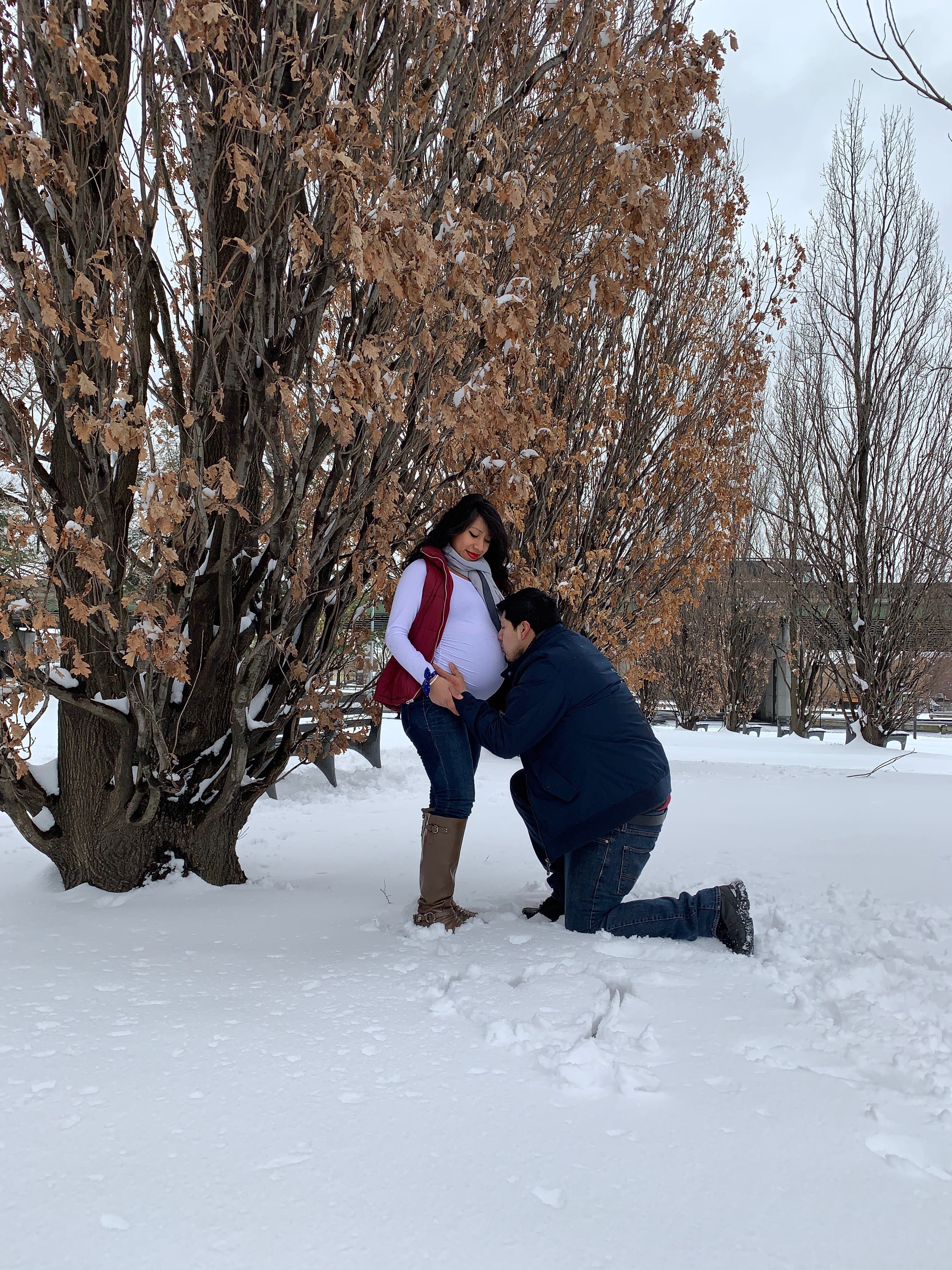 For my maternity pictures, we literally woke up, saw snow and grabbed our camera and left. When we got to the park, we realized we forgot our tripod so we took a garbage can and flipped it over and used it as our stand. (Yes we did that).